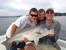 Pictured Above: Brothers Roger (left), Michael and father Roger Moccia Sr. with a 22 lb. striper caught July 2013 on a herring down deep.