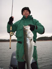 Mike Simmons from Maggie Valley N.C. with a nice December striper caught on a bucktail jig last year.